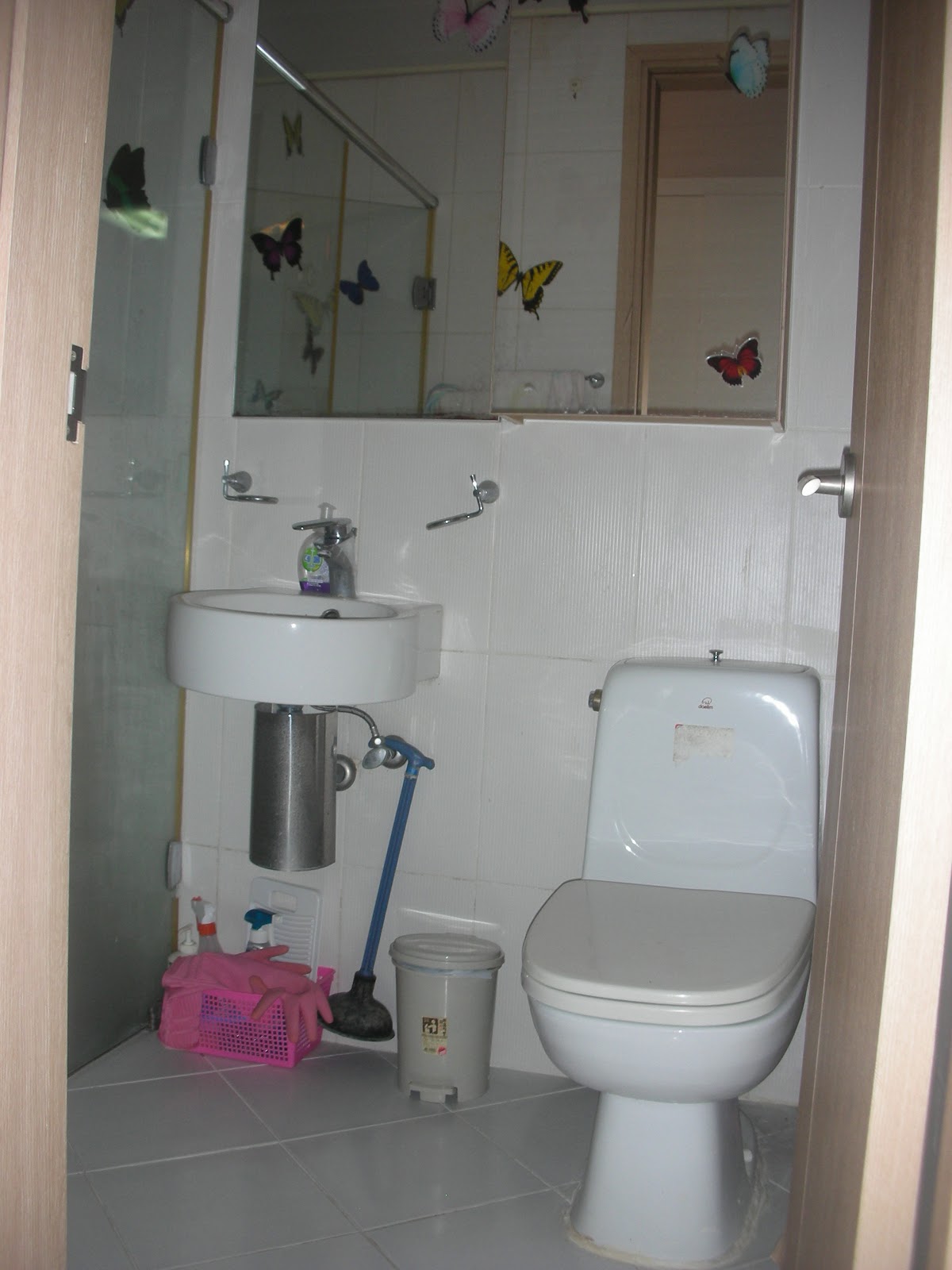 Mr. Lee insisted I'd have a bed by that evening and the rest would come soon. The room was clean; a layer of dust formed due to vacancy, but there was really nothing to complain about. Mr. Lee then opened Kyle's apartment, and it appeared no one moved out. There were decorations hanging, a few articles of clothing on the drying rack, books on the bookshelves (thank GOD, Kyle says), and dirty sheets on the bed. Everything is pink, by the way- rugs, towels, laundry baskets, trash cans, butterfly stickers all over the bathroom. Mr. Lee said, "Okay, I figure out and you come later. You put stuff in Shelly Teacher's room."